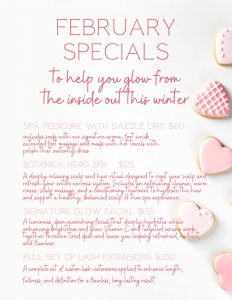 It’s here – the Valentine’s Day glow up menu that keeps your hair, skin, and nails looking their best for the month of LOVE. From our signature glow facial, packed with vitamin c and hydration, to our head spa –